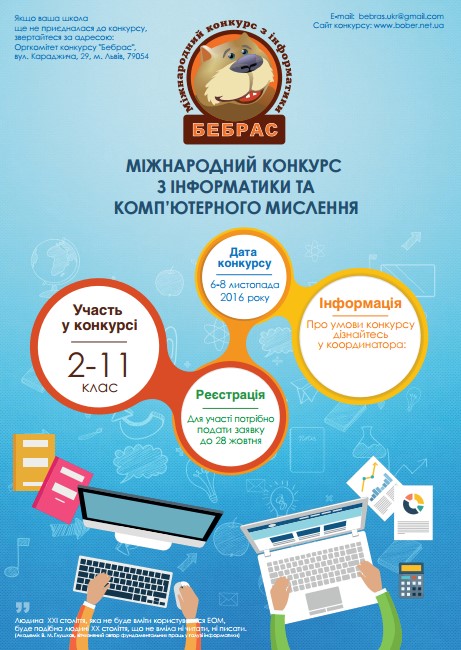 Запрошую усіх учнів 2-11 класів реєструватися на участь у конкурсі з інформатики та комп'ютерного мислення "Бобер", який відбудеться 6-8 листопада 2016 року. Реєстрація триватиме до 28 жовтня. Деталі участі можна з'ясувати у координатора (комп'ютерний кабінет), більше про конкурс - на сайті bober.net.ua/